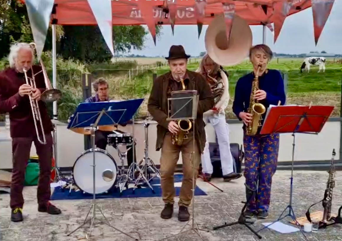 De Flabbergasten, met muziek van hot en her die swingt, zingt, stampt en soms schuurt. Eigen composities en verrassende bewerkingen van bestaande nummers. Met een vleugje New Orleans en veel speelplezier. Hildegard Sarrazin – saxen, Joy de Jong – Sousafoon en accordeon, Louis Godschalk – drums en percussie, Tjitze Vogel – trombone en Rob Vlaar – saxen en accordeon